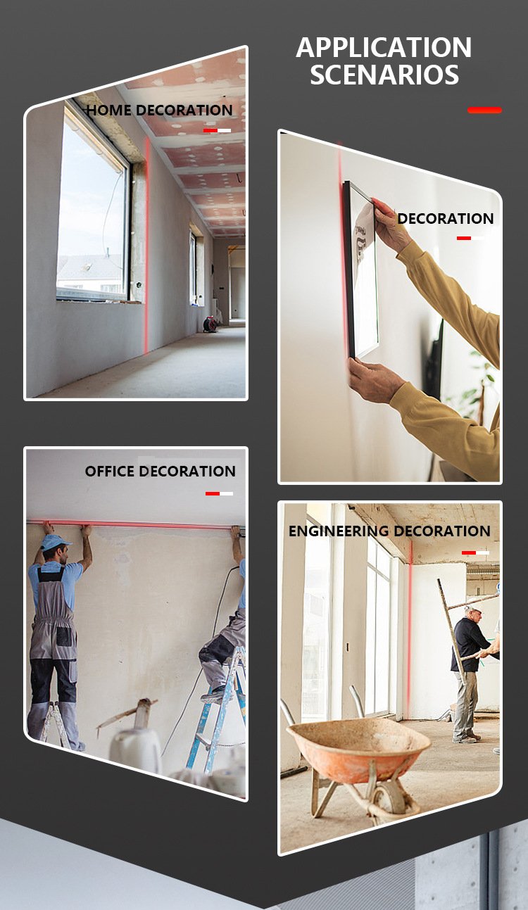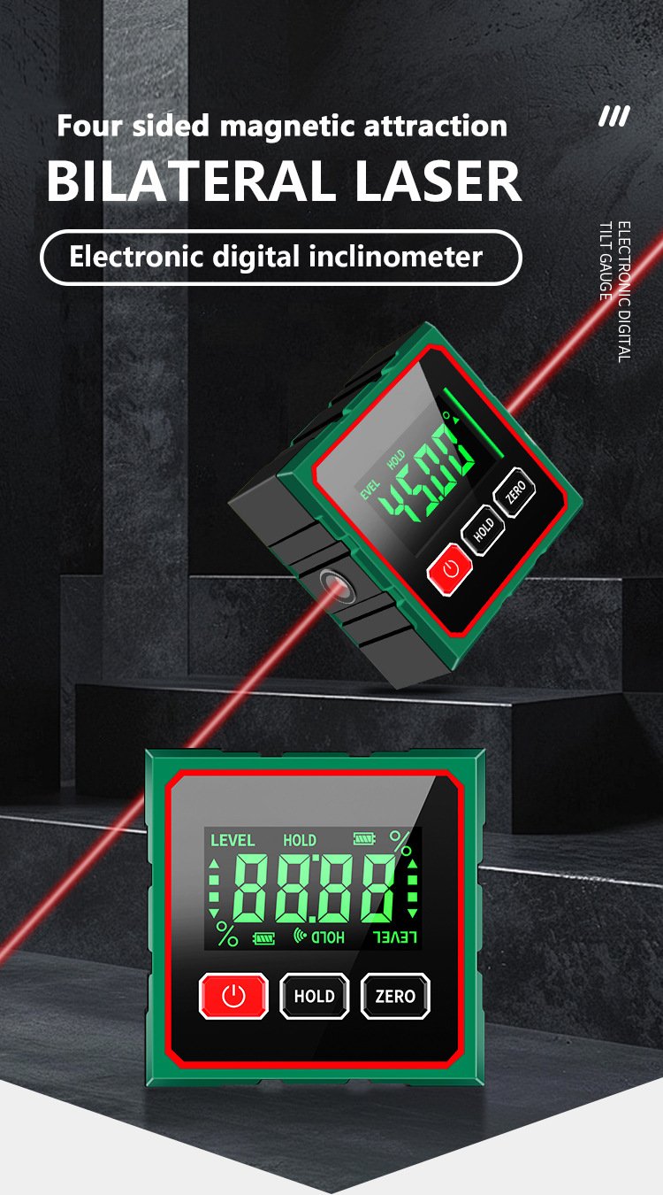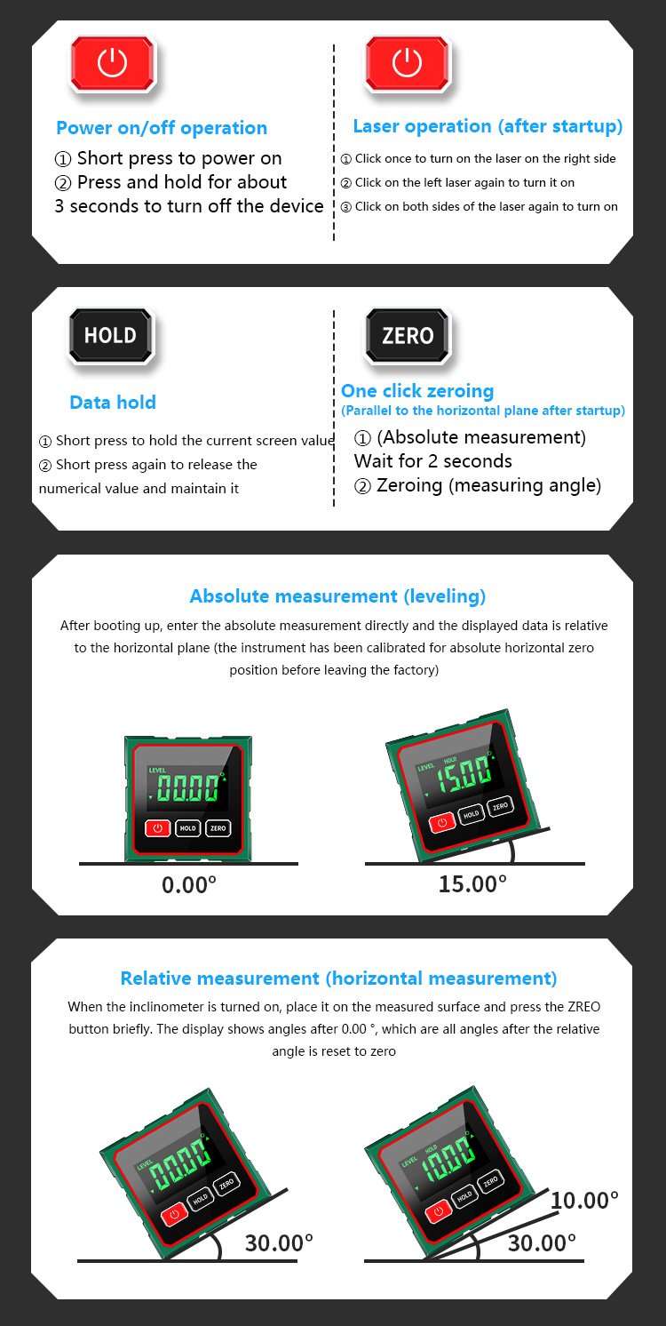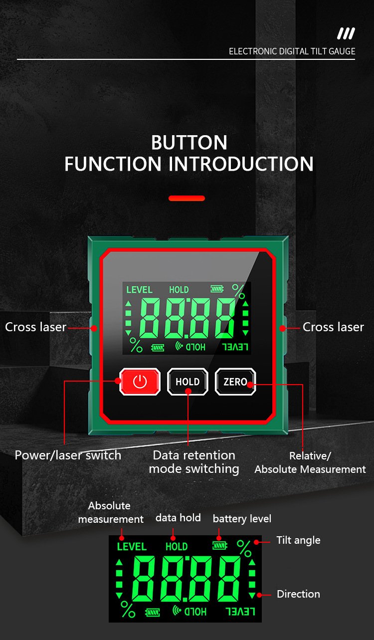 【Two-Sided Laser Line】The built-in red laser lines of the digital level on both sides are effective and convenient to carry out the horizontal and symmetrical work of home decoration. Three buttons can activate the red laser line, switch the unit of the measured value, hold the measured value, and zeroing function to realize relative measurement.