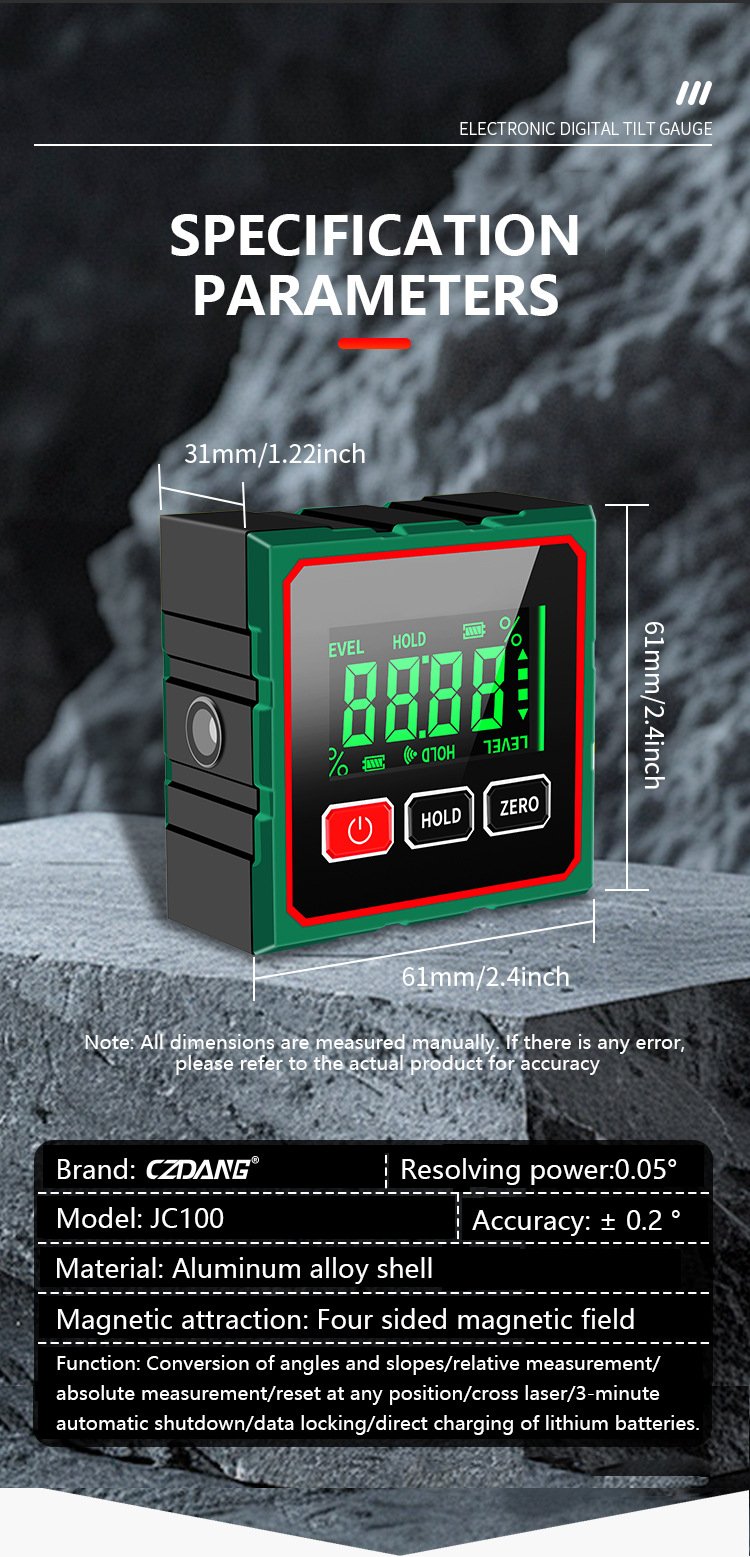 【Rechargeable】The protractor is rechargeable. It has an extremely long standby time. The battery level on the screen makes it easy to charge in time. And this digital level will automatically turn off after 3 minutes of no operation to save battery.